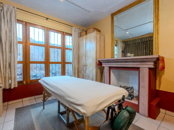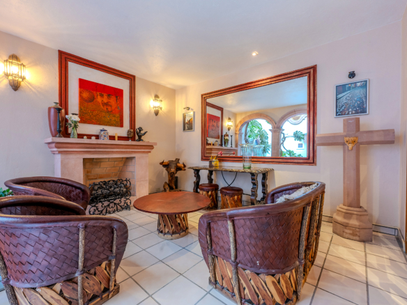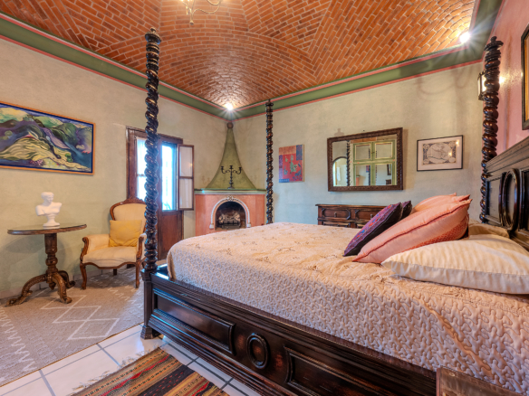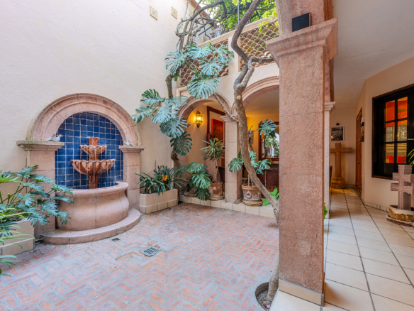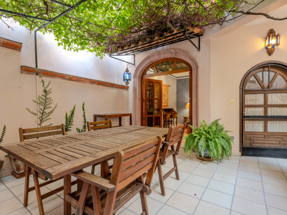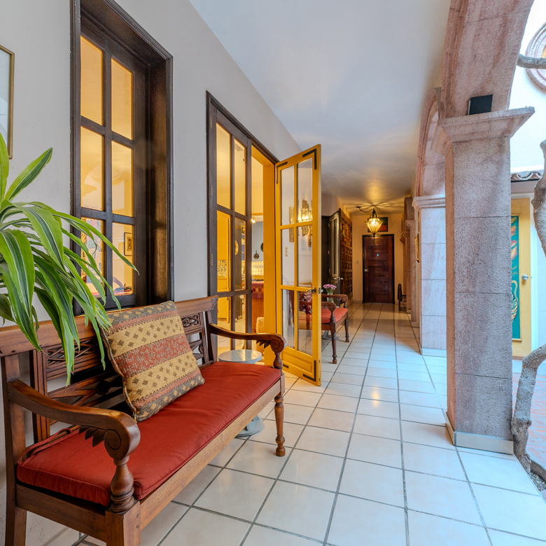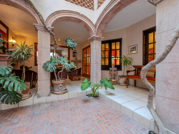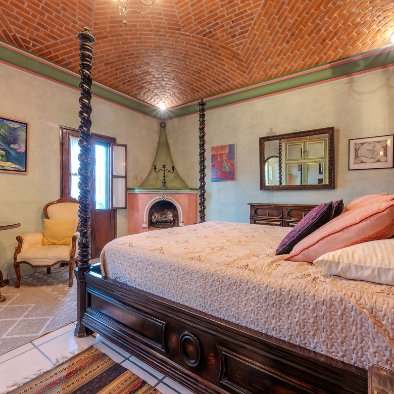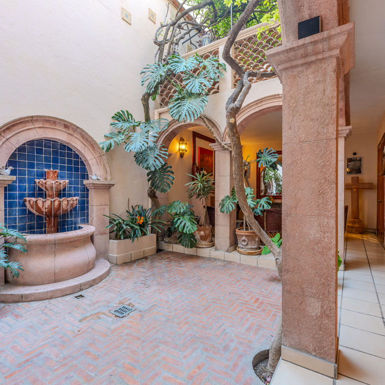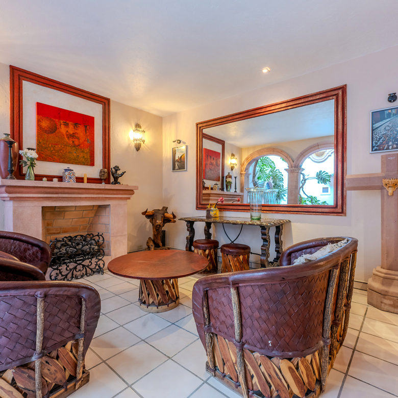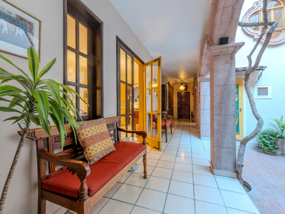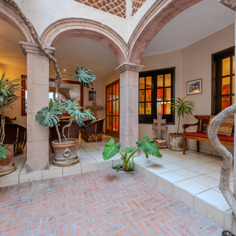 Tucked along one of Centro’s most coveted pedestrian streets—where footsteps gently replace the hum of traffic—Casa de las Cruces sits among a privileged collection of just twelve homes. This is the kind of address that feels discovered rather than simply found. The moment the door opens, the home reveals itself in layers: a welcoming vista stretches across the entry hall toward the sun-drenched courtyard, where a stone archway frames the first glimpse of refined colonial living. Here, a covered outdoor salon with one of the home’s seven fireplaces invites guests to linger, cocktail in hand, as soft light filters through.