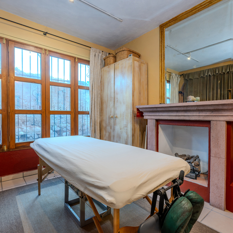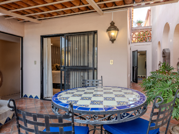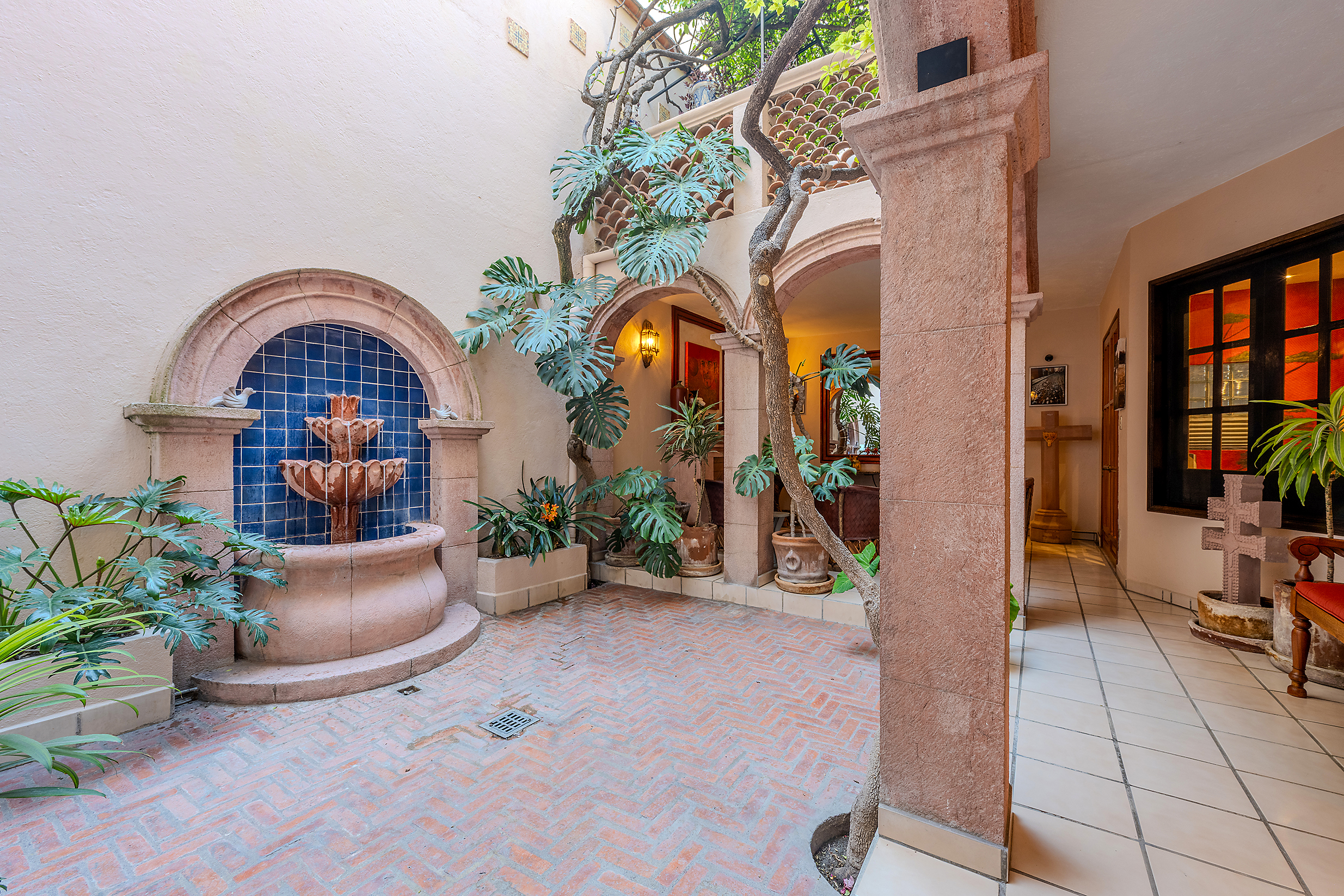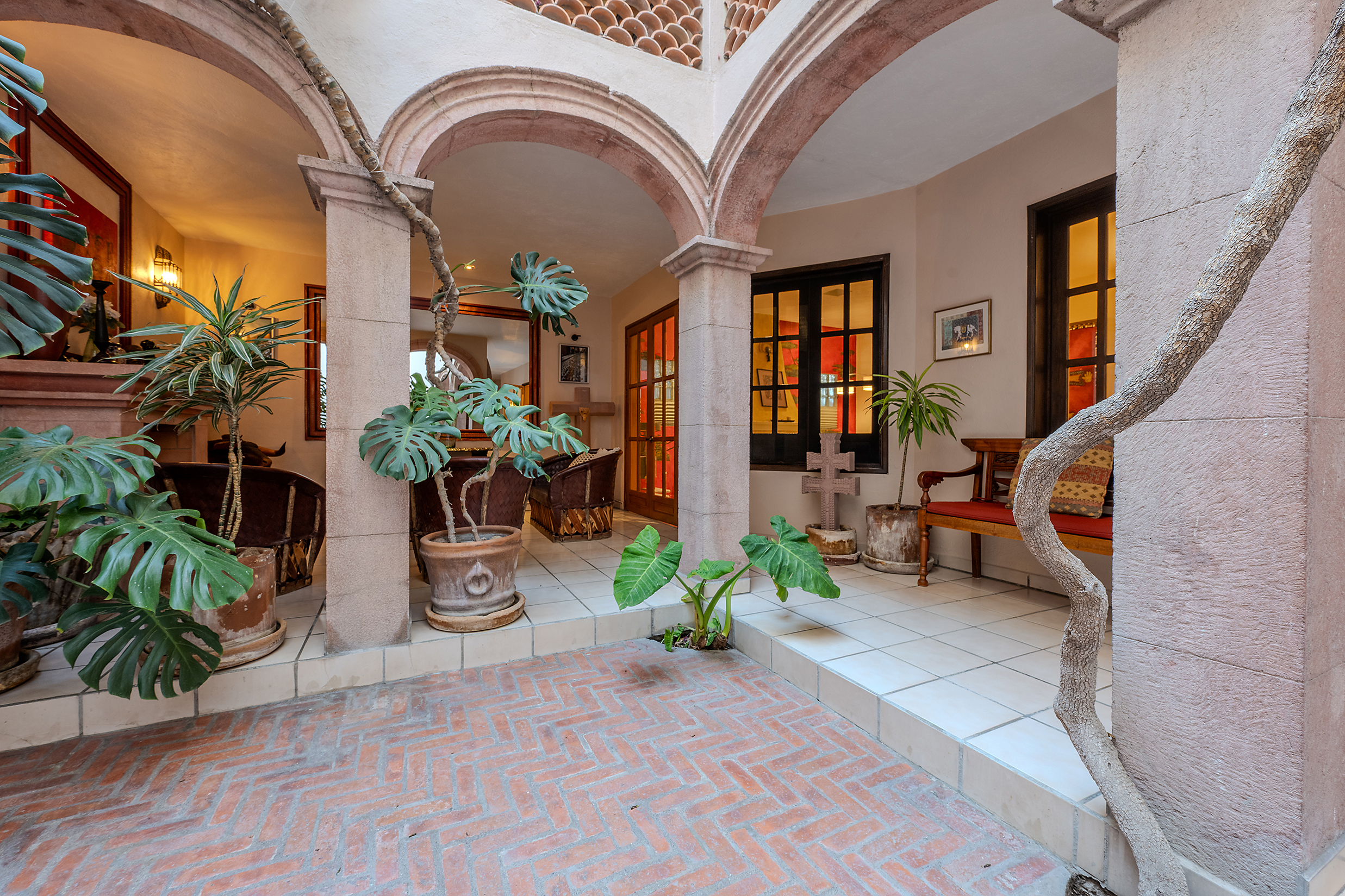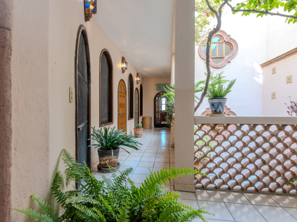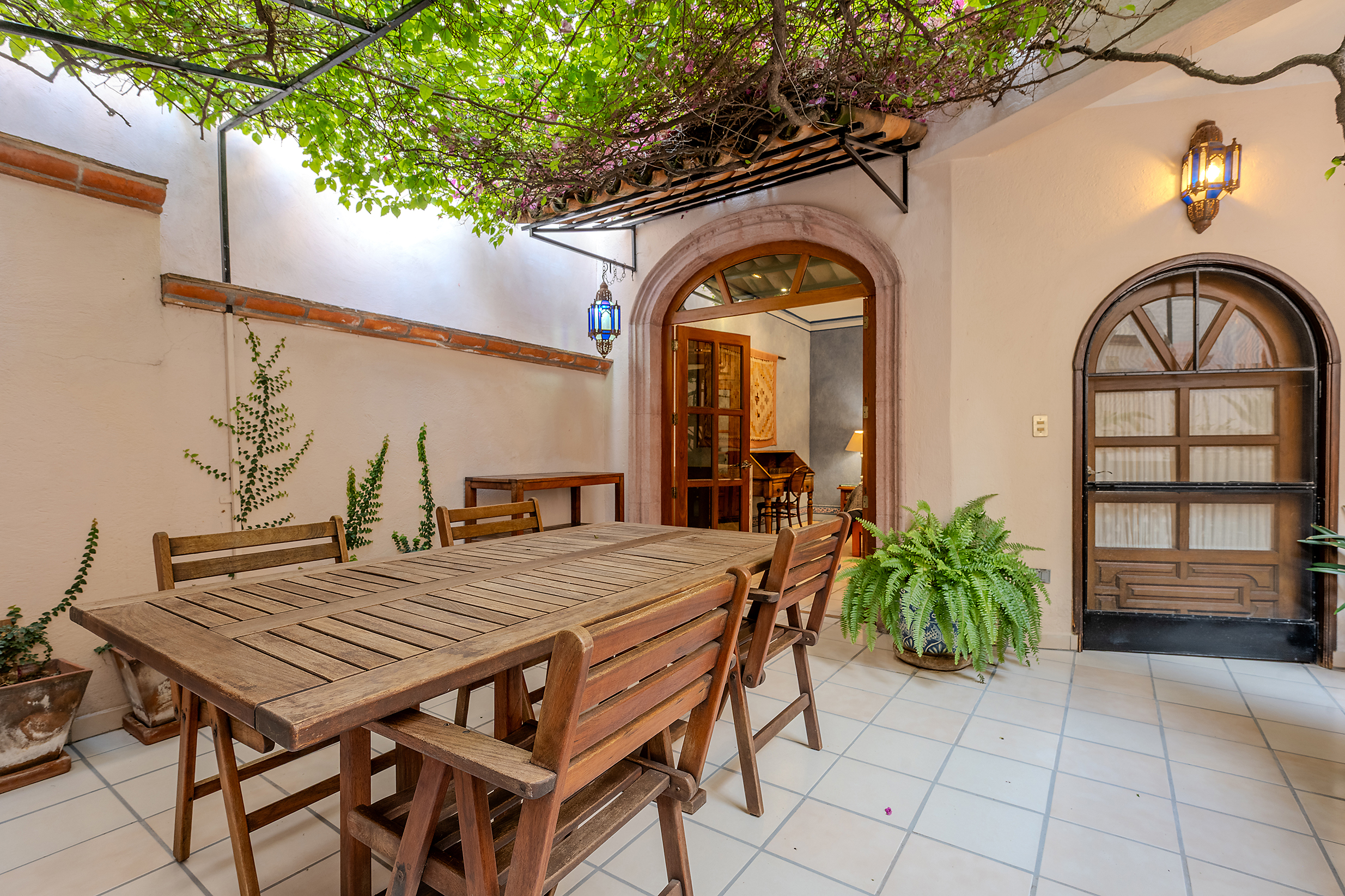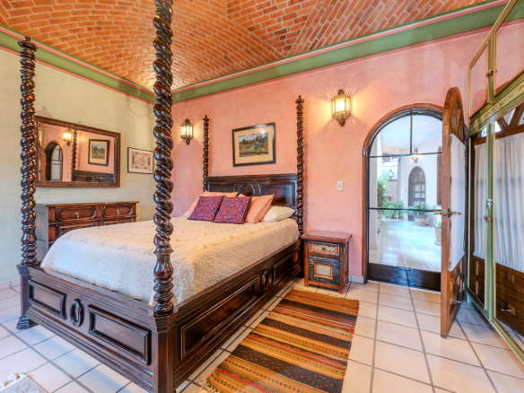 Tucked along one of Centro’s most coveted pedestrian streets—where footsteps gently replace the hum of traffic—Casa de las Cruces sits among a privileged collection of just twelve homes. This is the kind of address that feels discovered rather than simply found. The moment the door opens, the home reveals itself in layers: a welcoming vista stretches across the entry hall toward the sun-drenched courtyard, where a stone archway frames the first glimpse of refined colonial living. Here, a covered outdoor salon with one of the home’s seven fireplaces invites guests to linger, cocktail in hand, as soft light filters through.