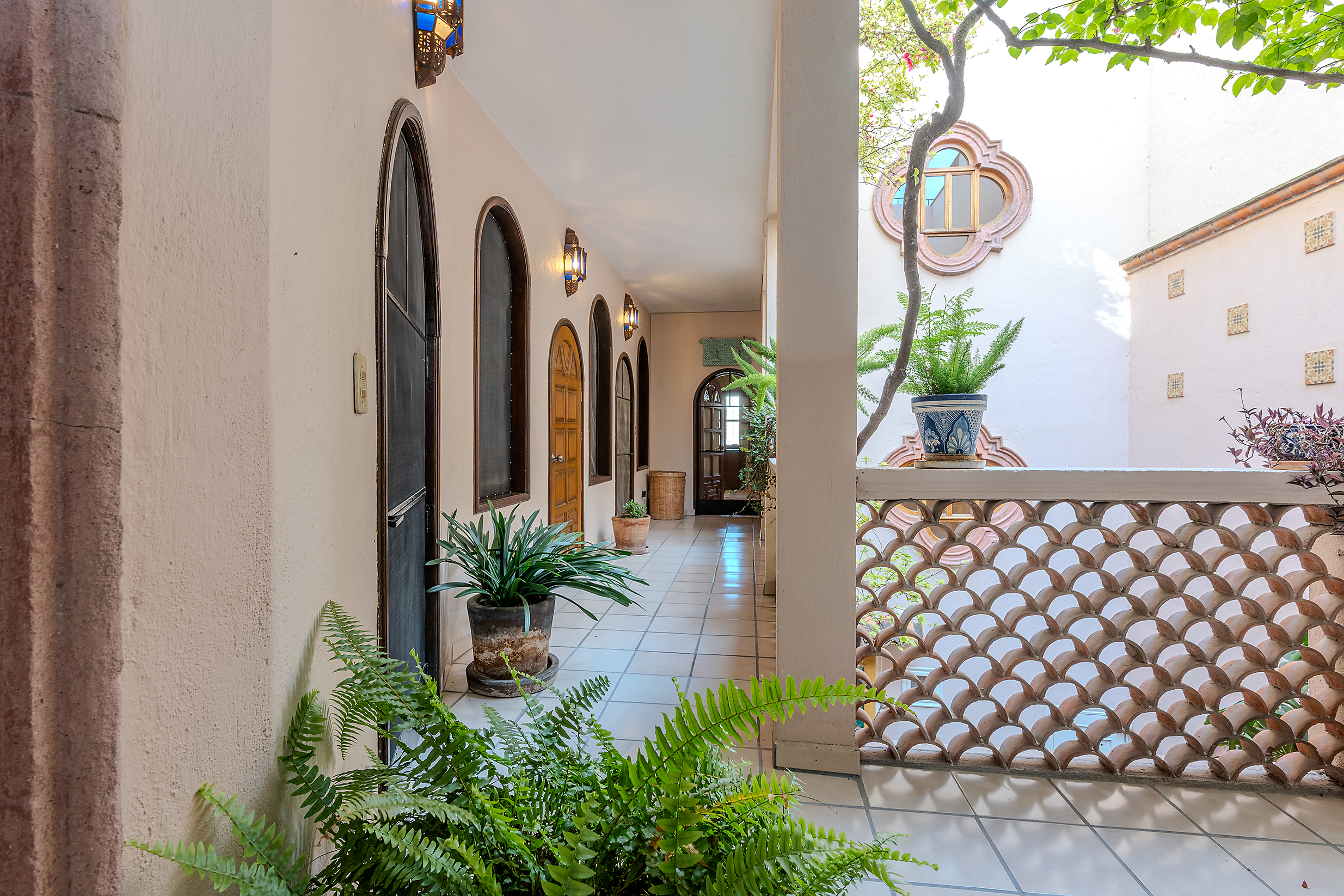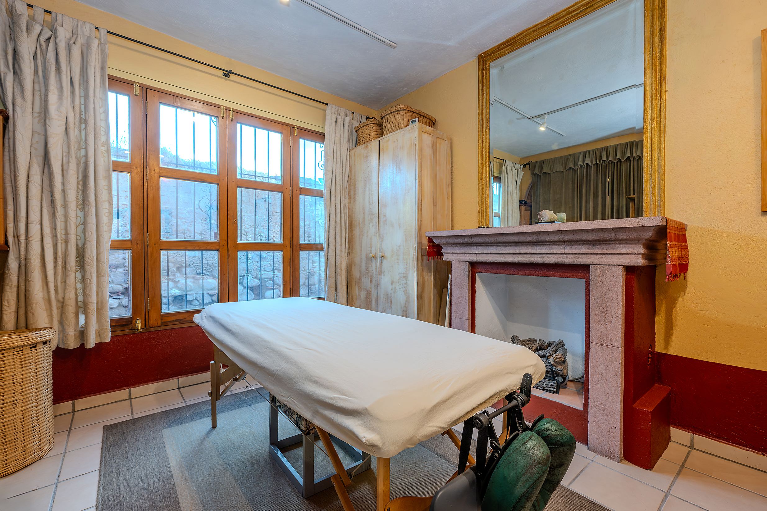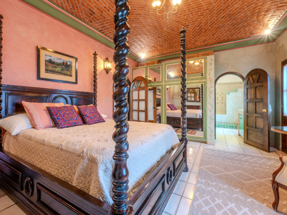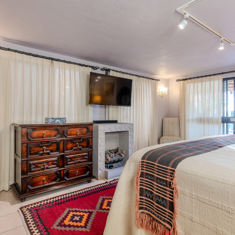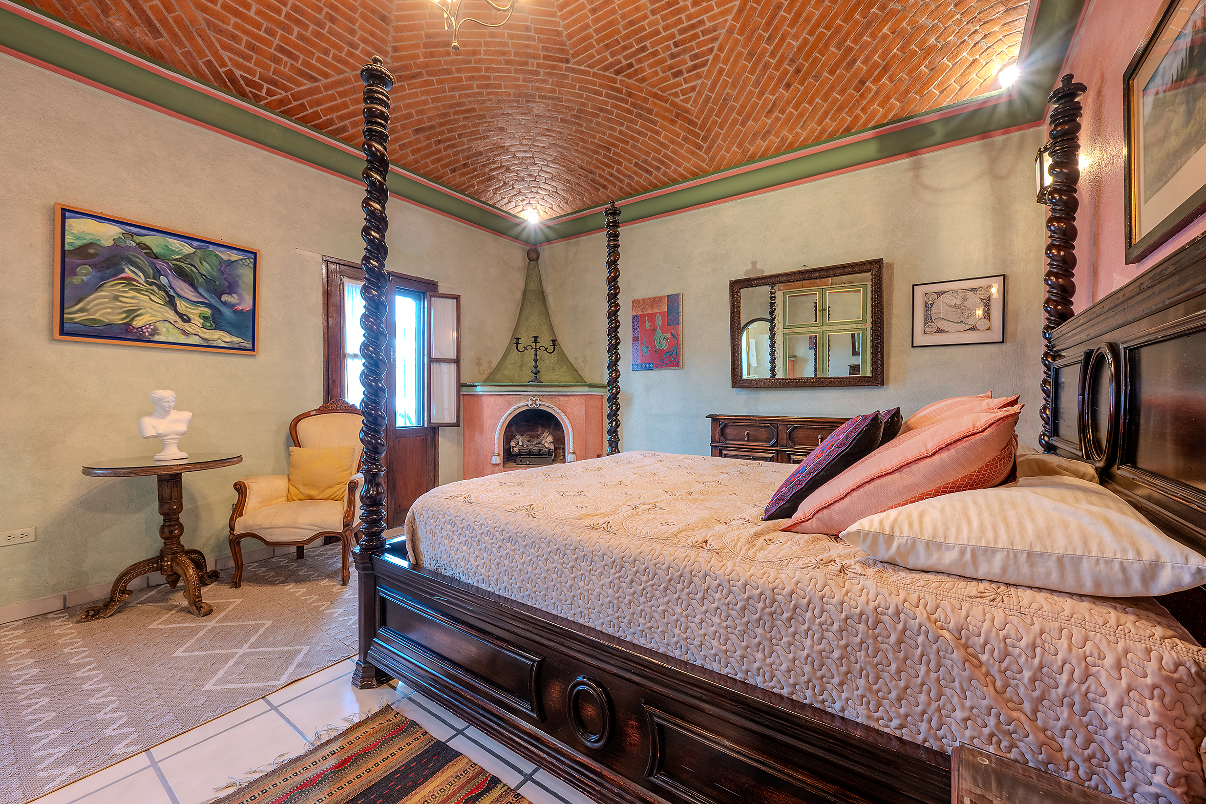 Tucked along one of Centro’s most coveted pedestrian streets—where footsteps gently replace the hum of traffic—Casa de las Cruces sits among a privileged collection of just twelve homes. This is the kind of address that feels discovered rather than simply found. The moment the door opens, the home reveals itself in layers: a welcoming vista stretches across the entry hall toward the sun-drenched courtyard, where a stone archway frames the first glimpse of refined colonial living. Here, a covered outdoor salon with one of the home’s seven fireplaces invites guests to linger, cocktail in hand, as soft light filters through.