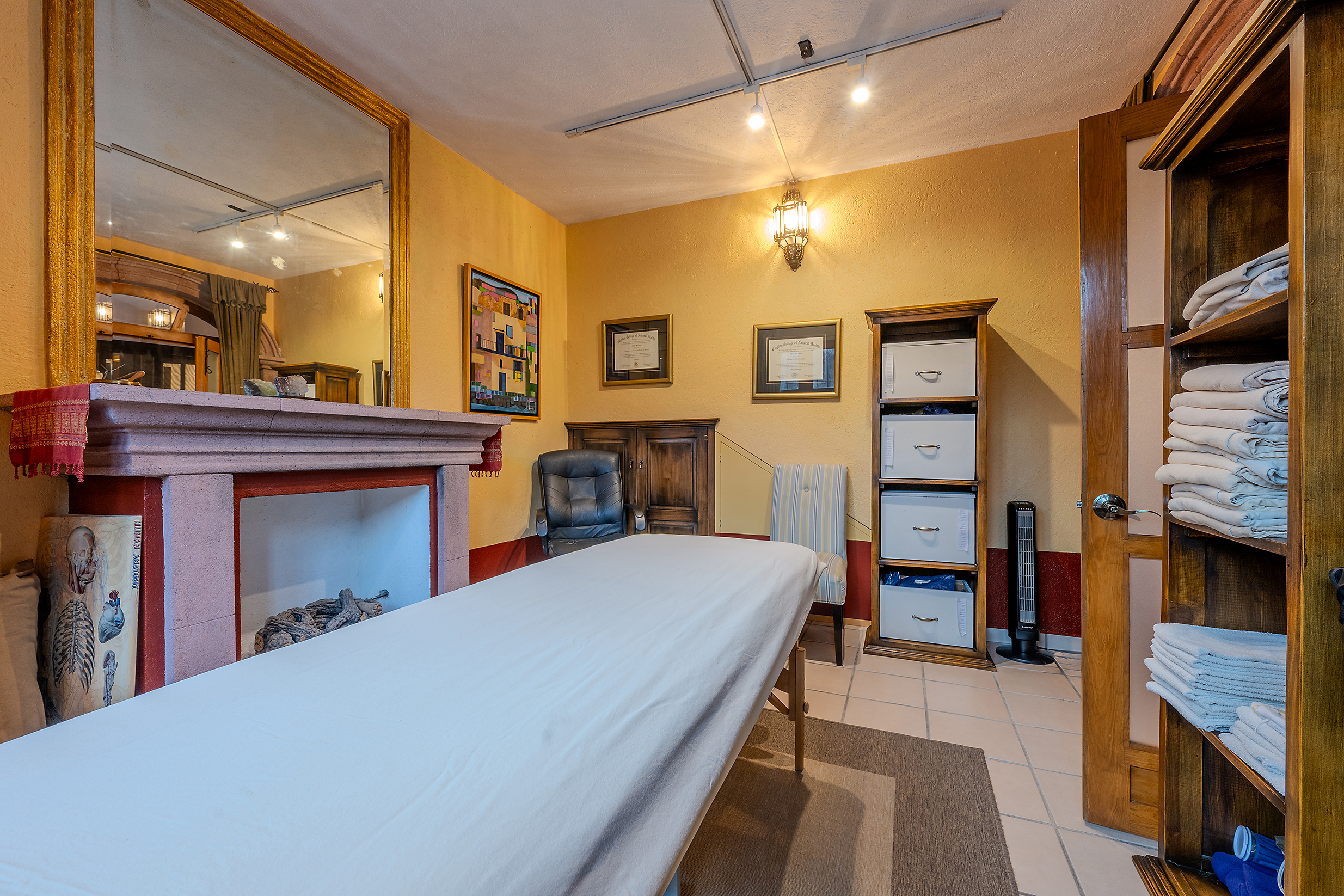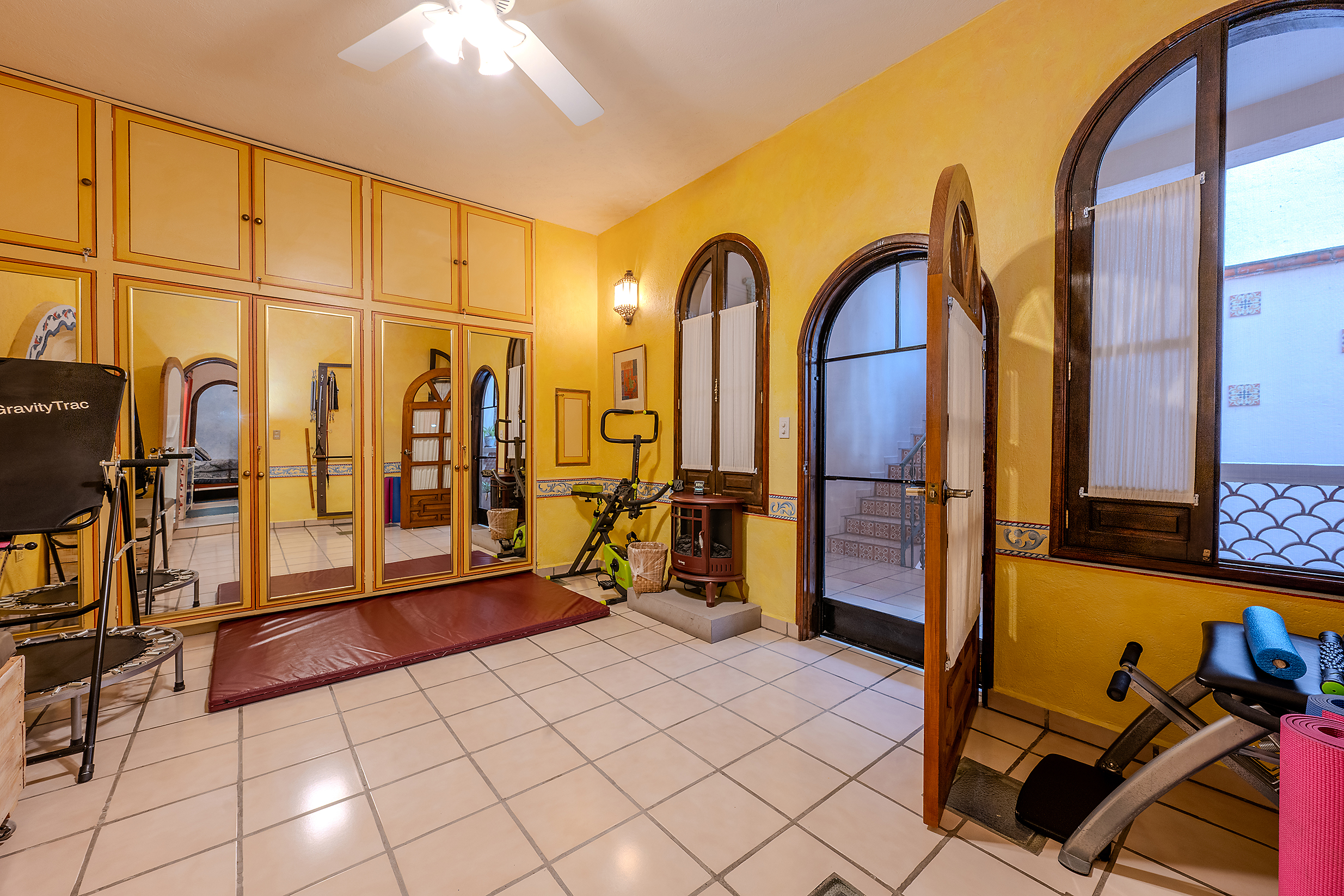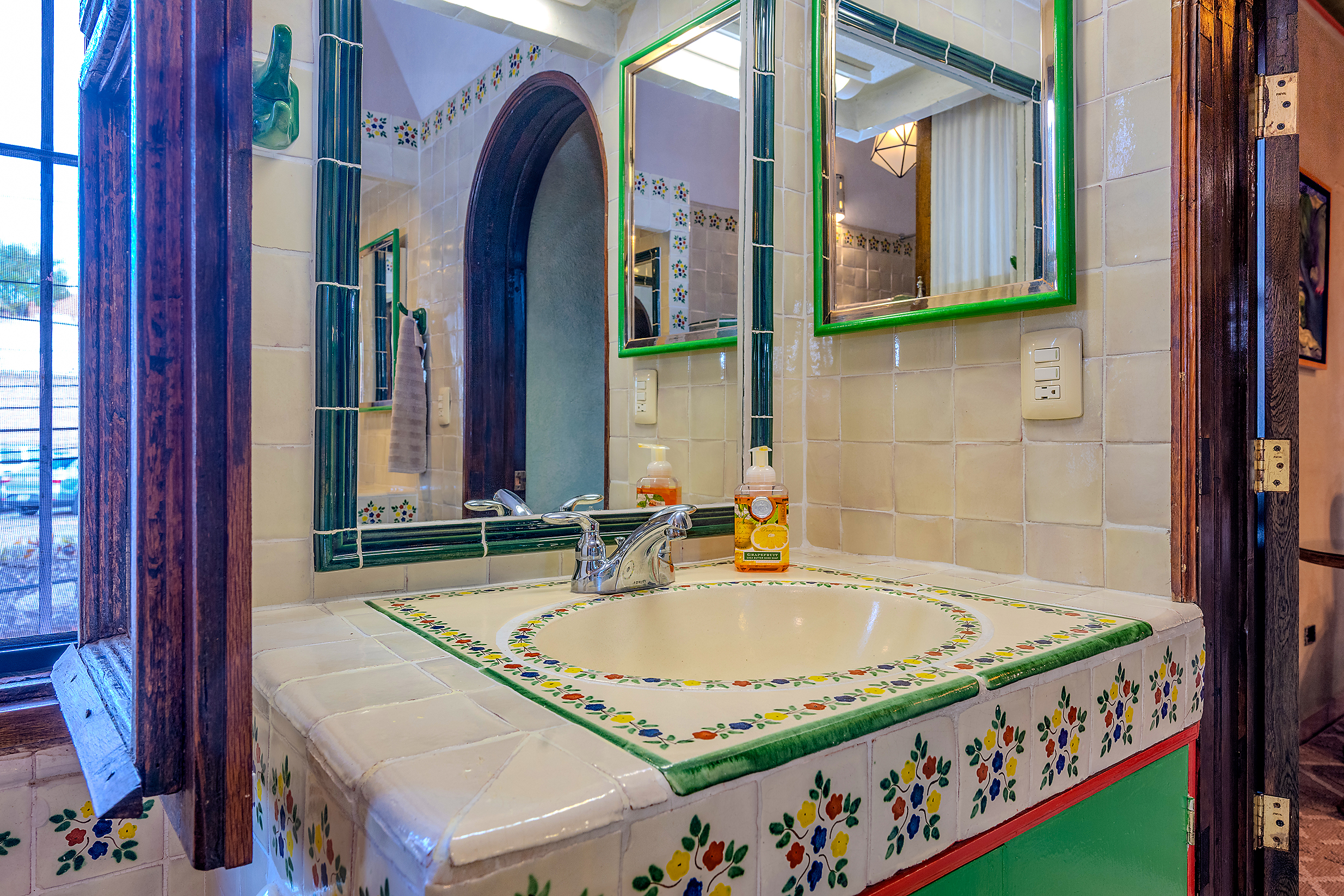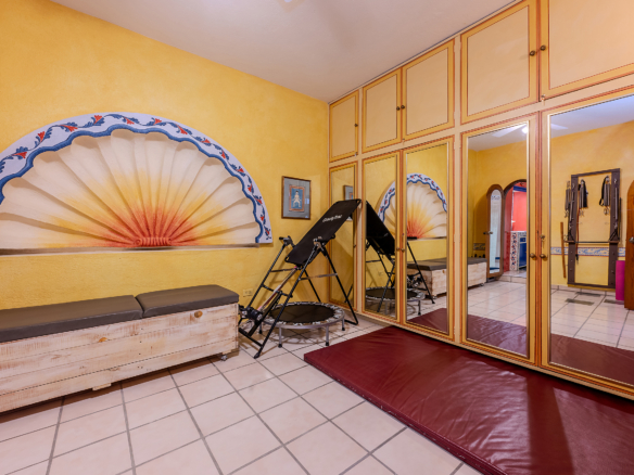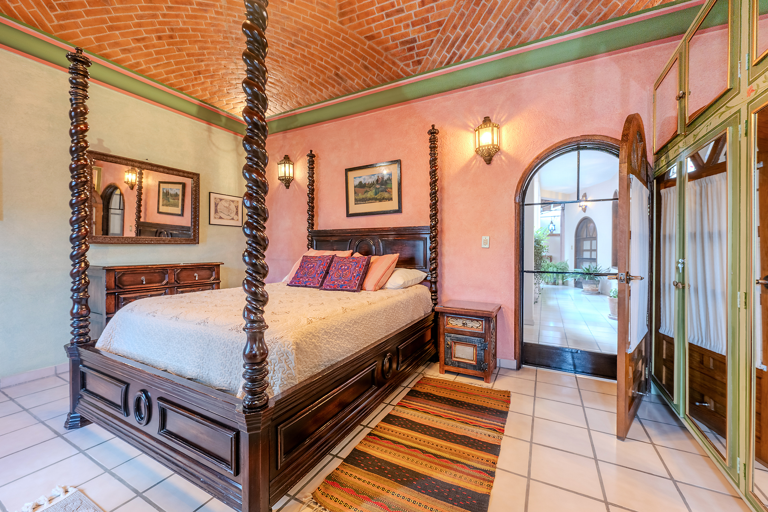 Tucked along one of Centro’s most coveted pedestrian streets—where footsteps gently replace the hum of traffic—Casa de las Cruces sits among a privileged collection of just twelve homes. This is the kind of address that feels discovered rather than simply found. The moment the door opens, the home reveals itself in layers: a welcoming vista stretches across the entry hall toward the sun-drenched courtyard, where a stone archway frames the first glimpse of refined colonial living. Here, a covered outdoor salon with one of the home’s seven fireplaces invites guests to linger, cocktail in hand, as soft light filters through.