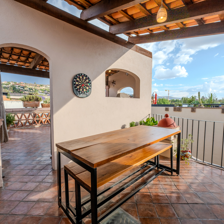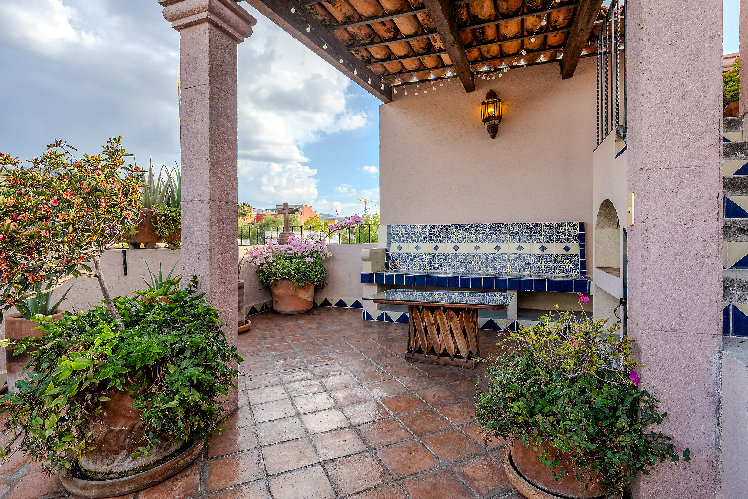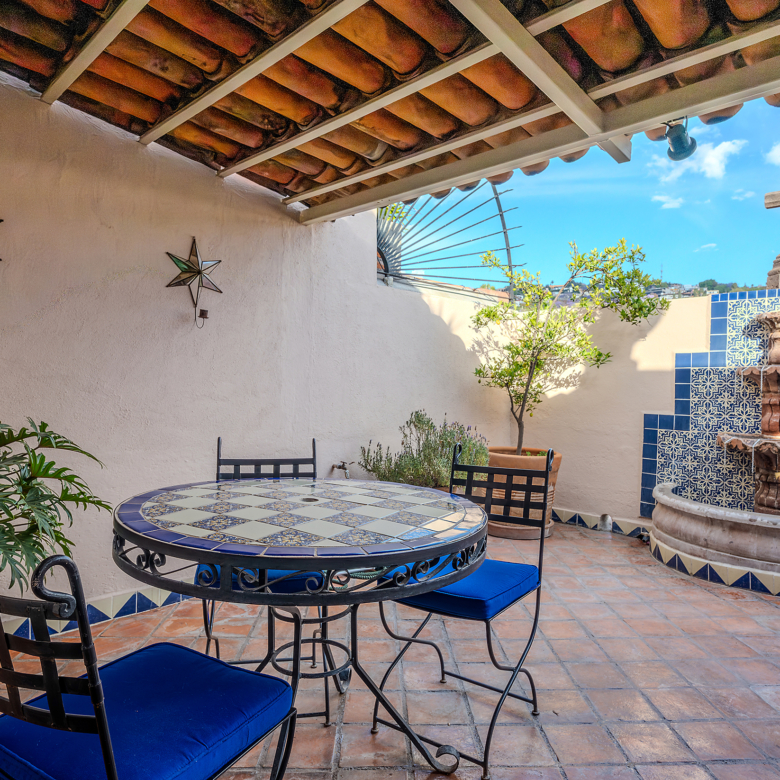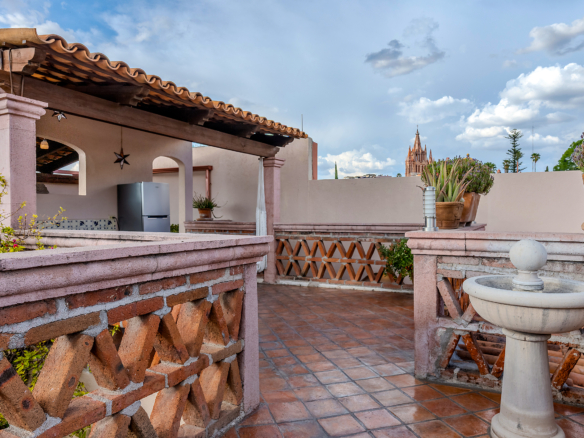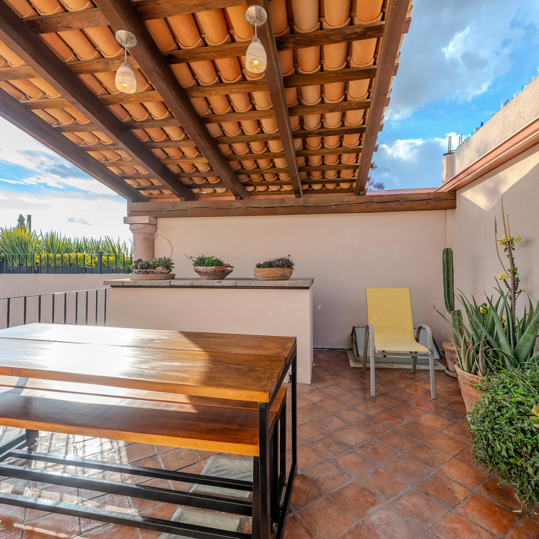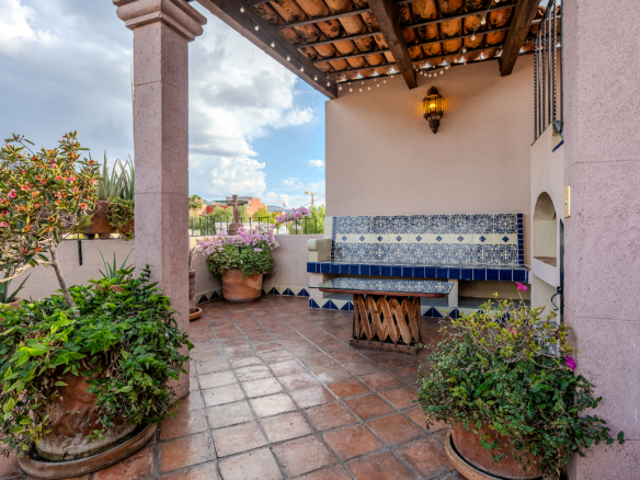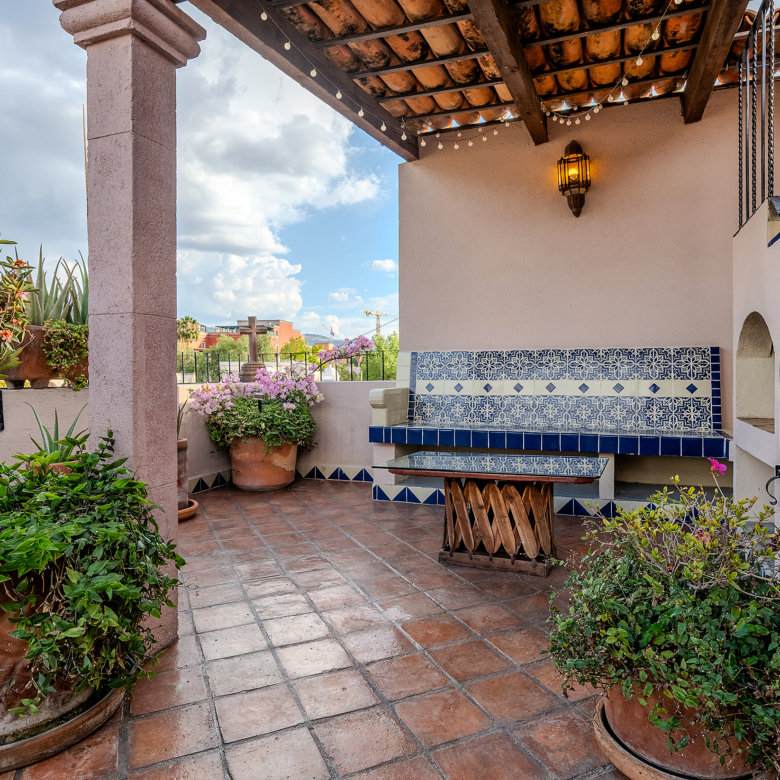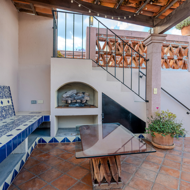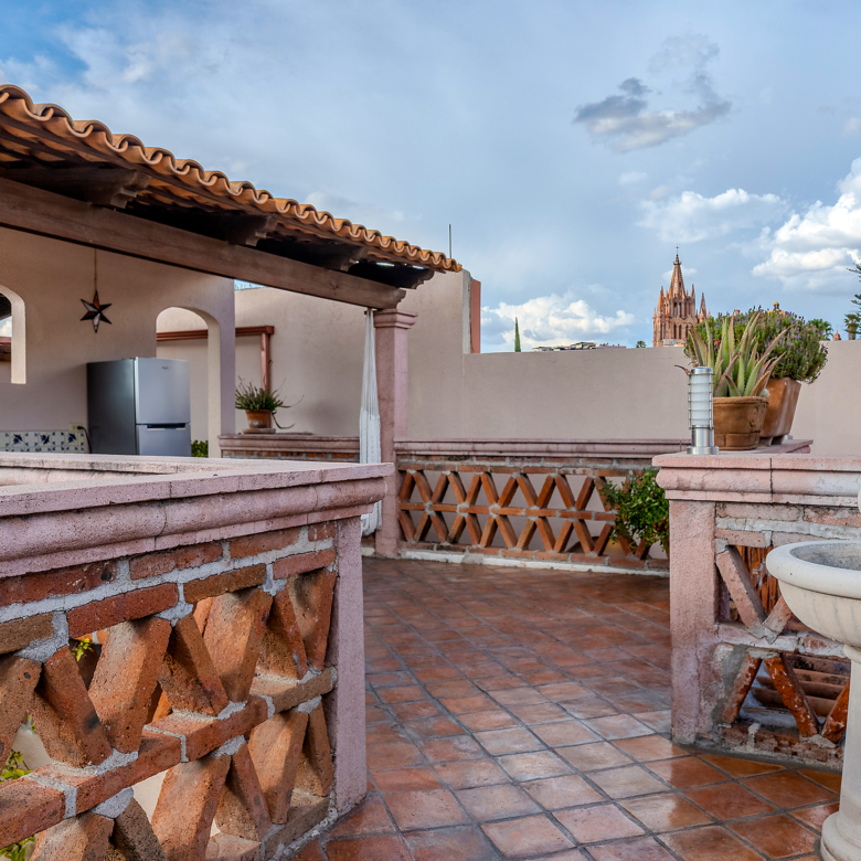The kitchen is the heart of this narrative, glowing with classic cream-and-blue tile that speaks to San Miguel’s heritage. Its charm is enhanced by thoughtful modern upgrades in stainless steel, creating a space that feels at once nostalgic and inspiring. And when it’s time to entertain on the rooftop, a discreet “vertical waiter” delivers dishes and drinks with elegant ease. Up above, the outdoor kitchen becomes a stage for unforgettable evenings, with La Parroquia rising in the distance like a living painting.
