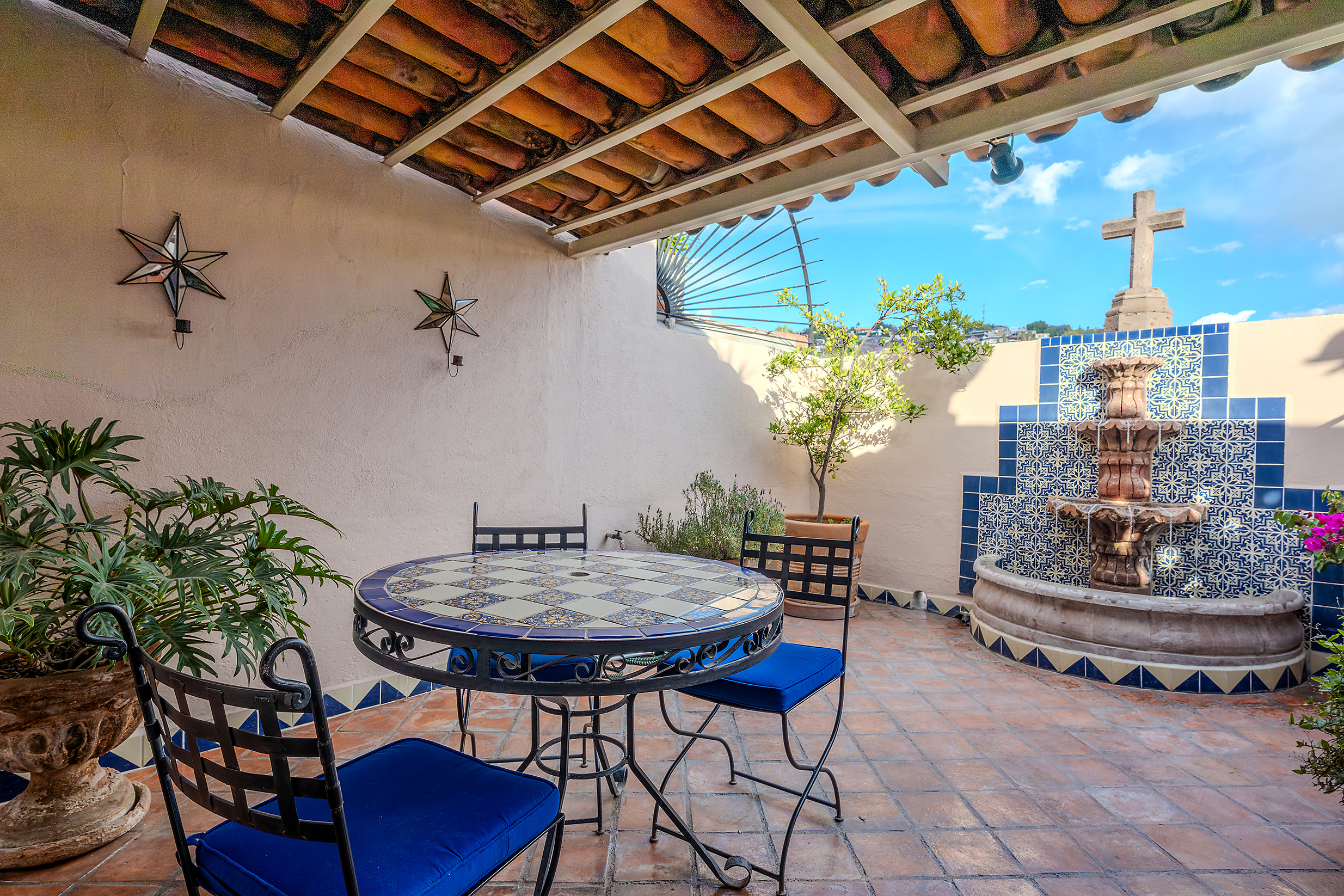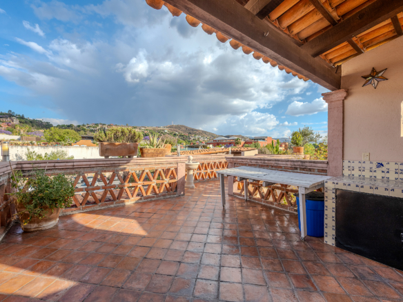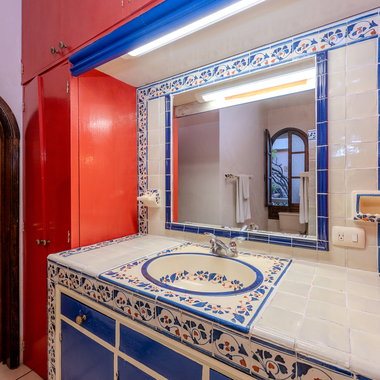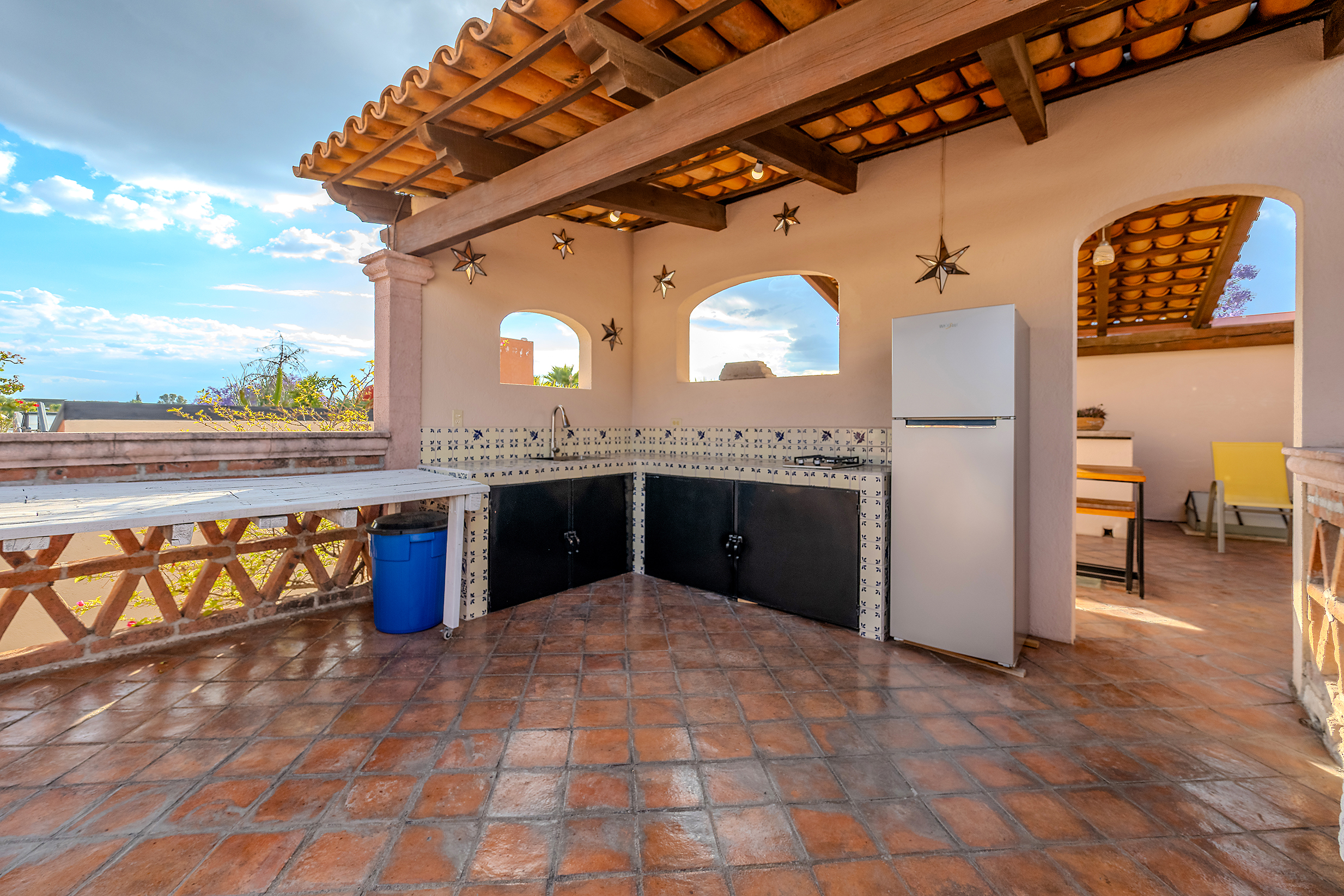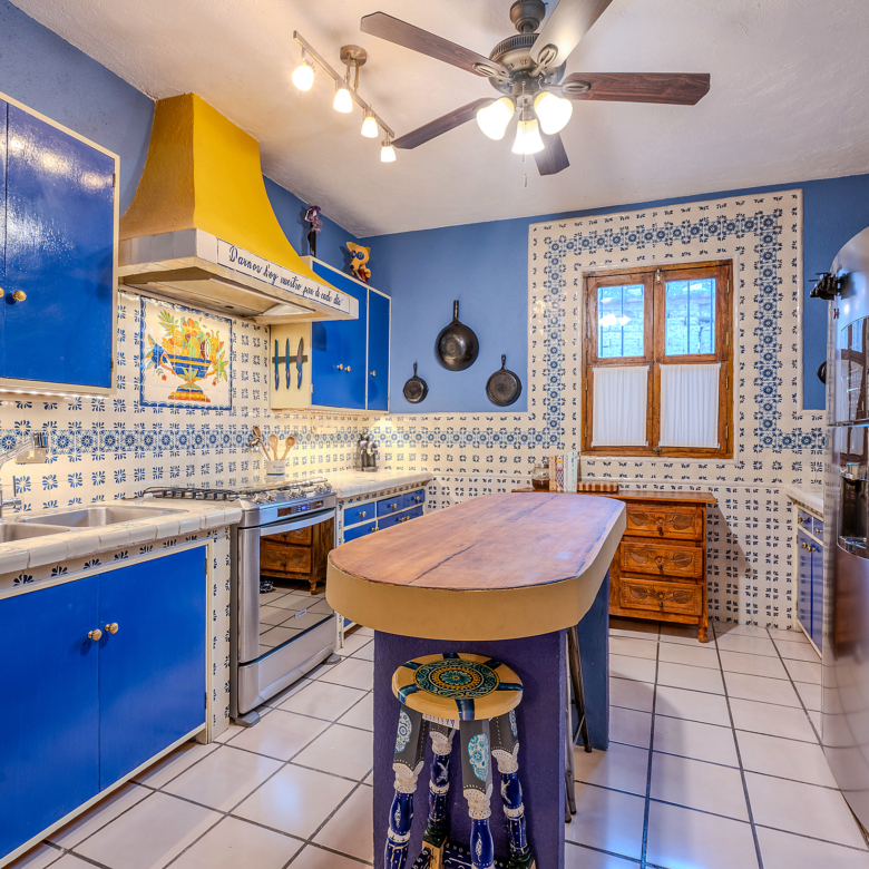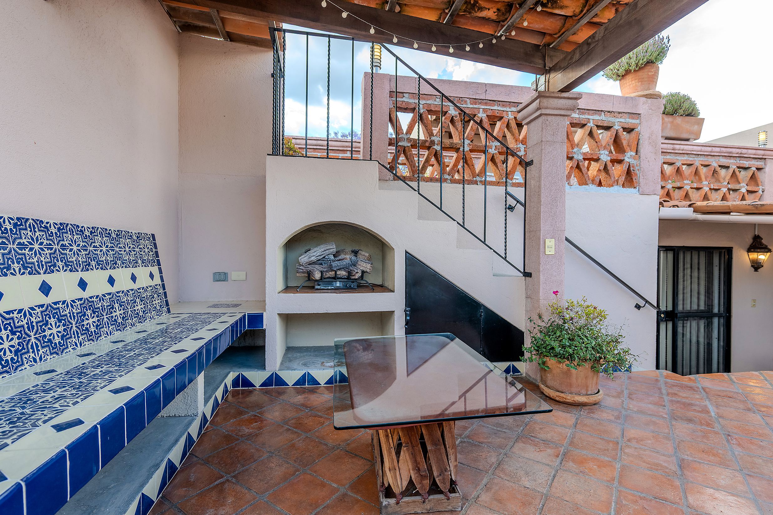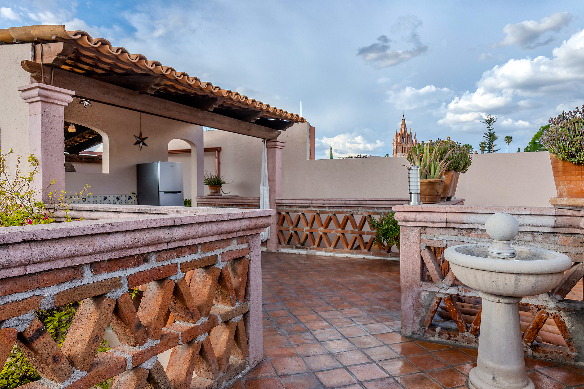 The kitchen is the heart of this narrative, glowing with classic cream-and-blue tile that speaks to San Miguel’s heritage. Its charm is enhanced by thoughtful modern upgrades in stainless steel, creating a space that feels at once nostalgic and inspiring. And when it’s time to entertain on the rooftop, a discreet “vertical waiter” delivers dishes and drinks with elegant ease. Up above, the outdoor kitchen becomes a stage for unforgettable evenings, with La Parroquia rising in the distance like a living painting.