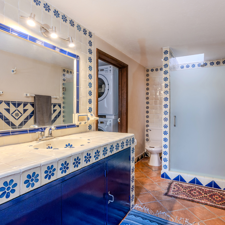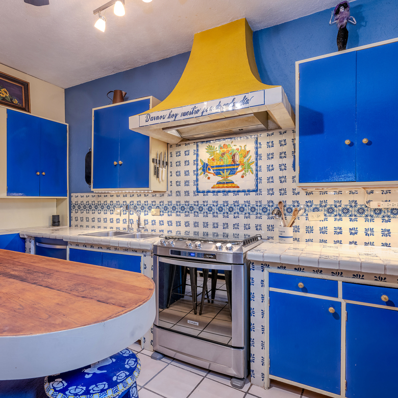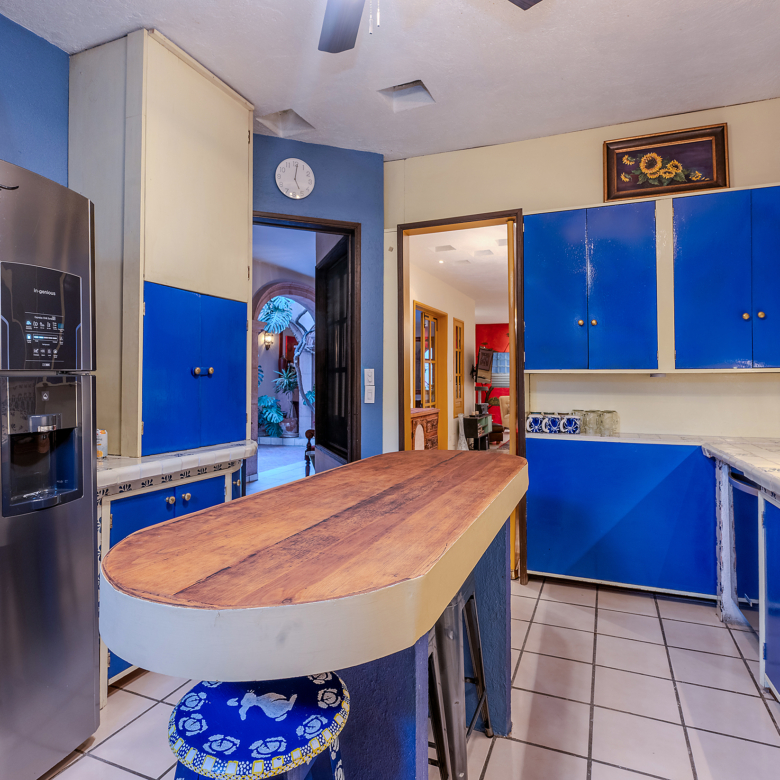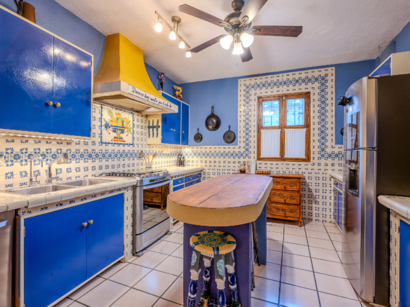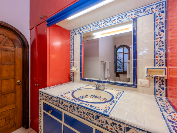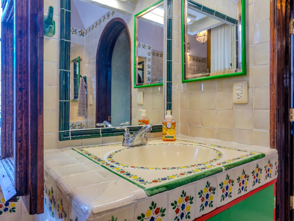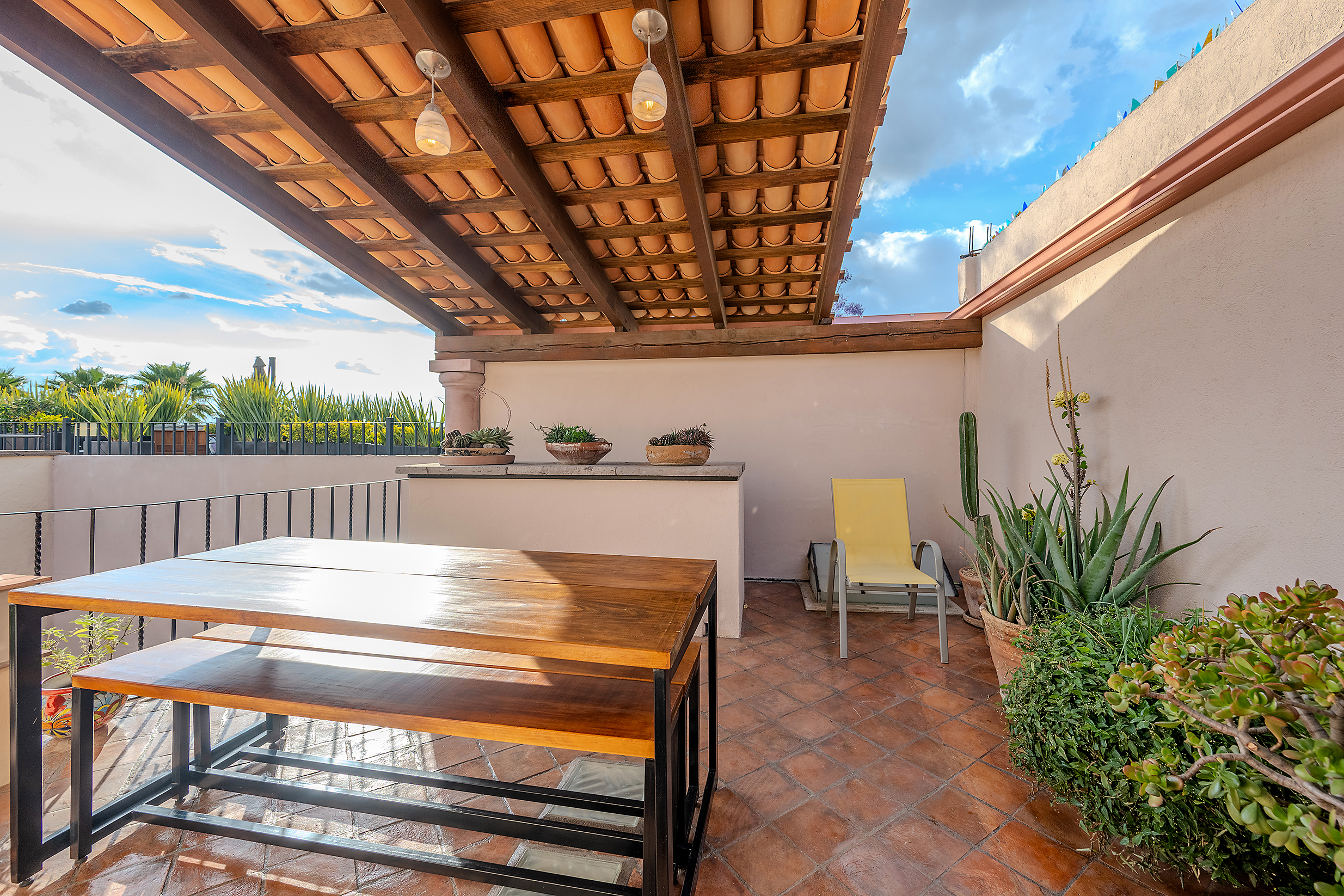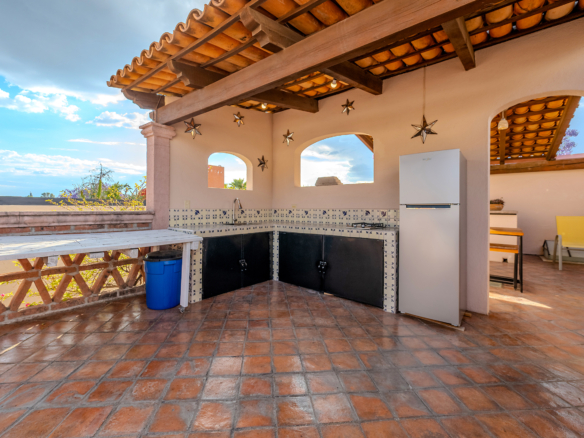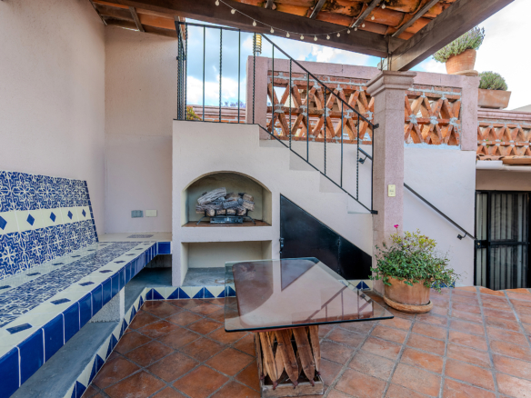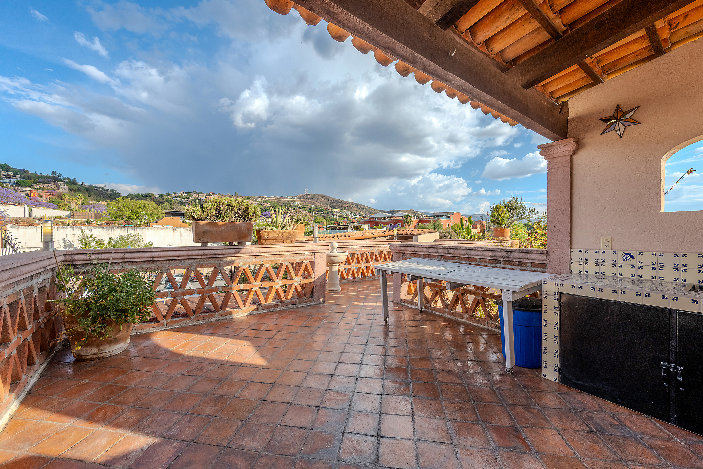 The kitchen is the heart of this narrative, glowing with classic cream-and-blue tile that speaks to San Miguel’s heritage. Its charm is enhanced by thoughtful modern upgrades in stainless steel, creating a space that feels at once nostalgic and inspiring. And when it’s time to entertain on the rooftop, a discreet “vertical waiter” delivers dishes and drinks with elegant ease. Up above, the outdoor kitchen becomes a stage for unforgettable evenings, with La Parroquia rising in the distance like a living painting.