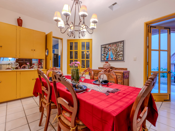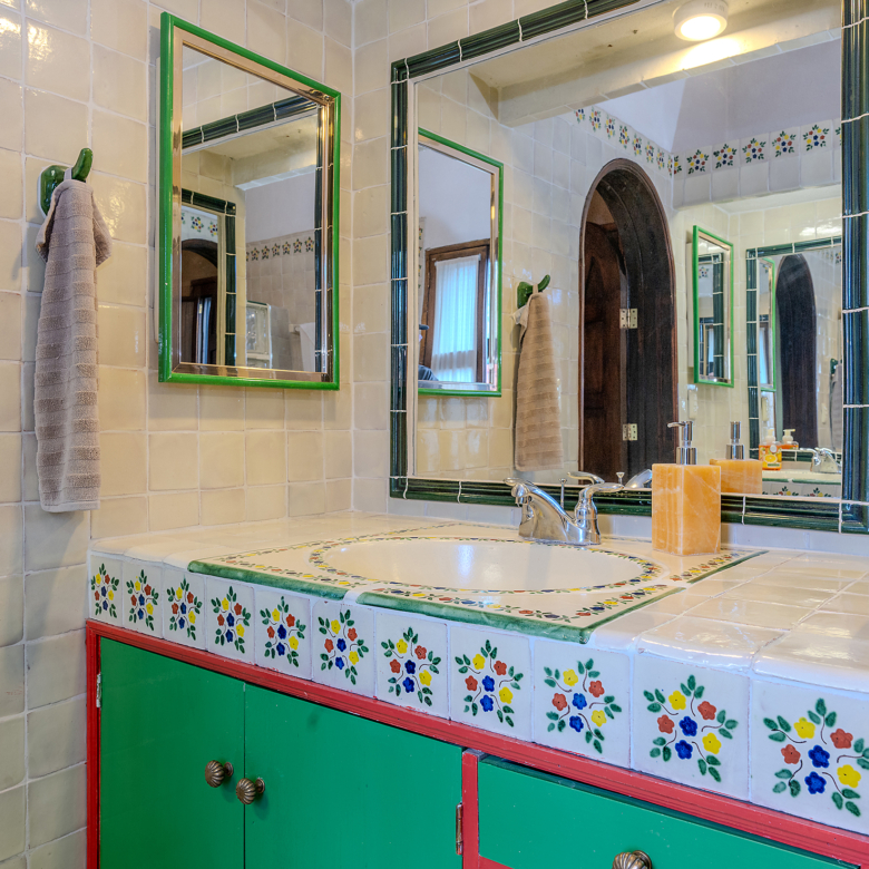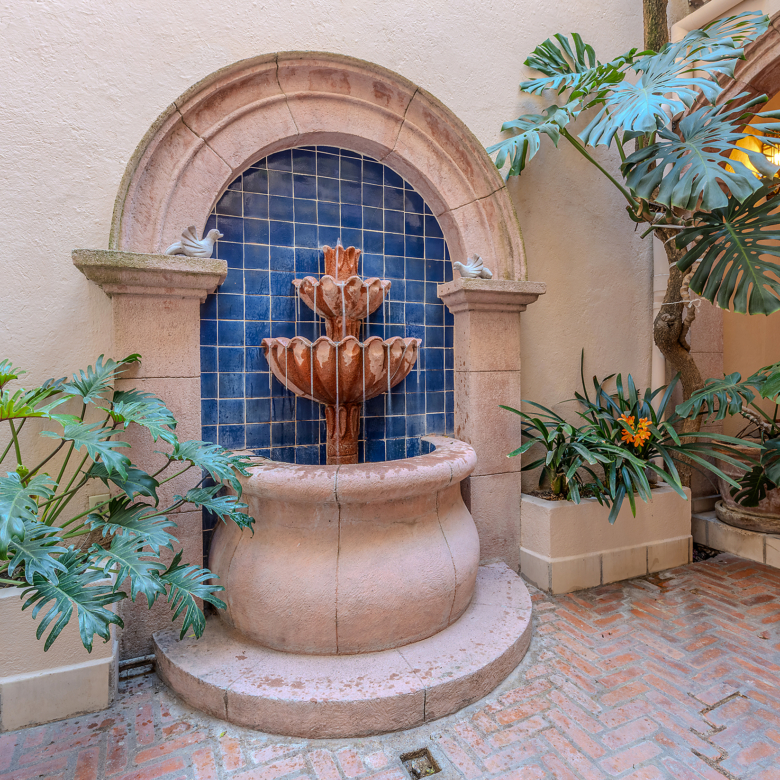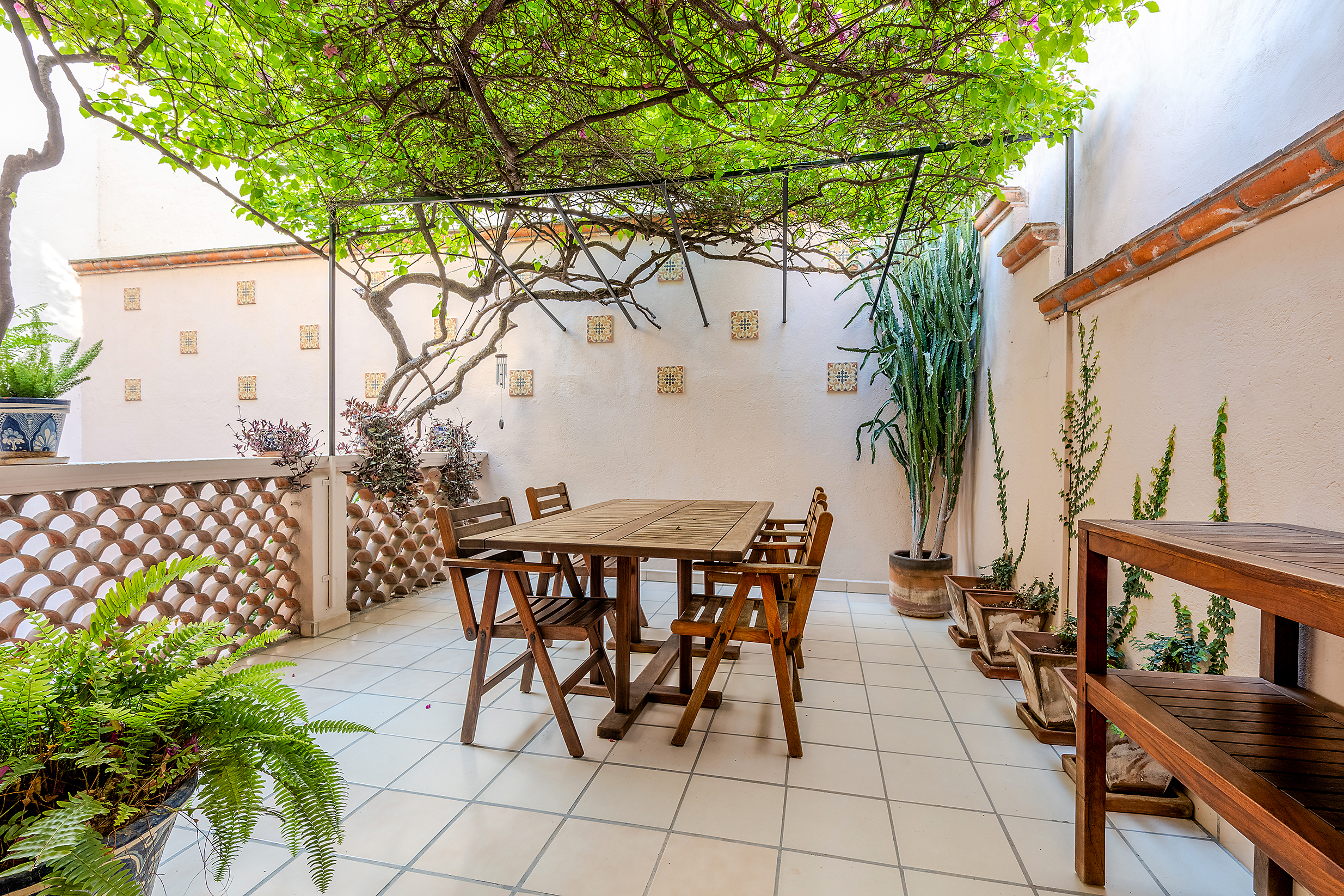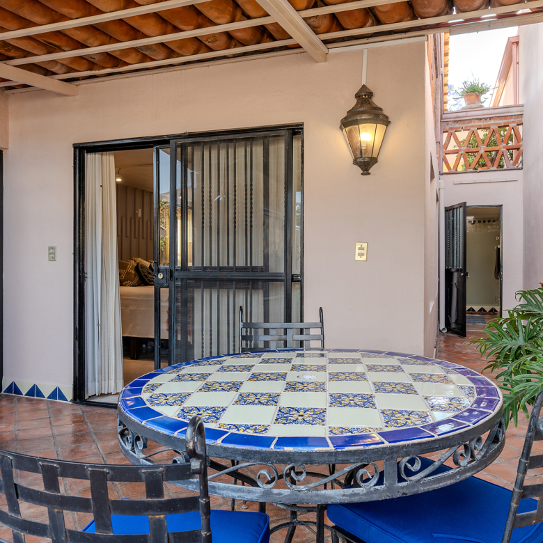 Dining al fresco here is not an occasional treat—it’s a lifestyle, elevated on all four sides of the home. On the ground level, mature greenery wraps the courtyard in privacy. On the second level, a vine-draped trellis frames an intimate table for six outside the Plata Bedroom’s French doors. On the third floor, the Lavender Bedroom opens to a private perch where meals are accompanied by sky and silence. And crowning it all, the shaded rooftop dining room—finished in traditional red clay tile—offers a generous table for gathering friends as the evening sky glows with the Rosewood fireworks.